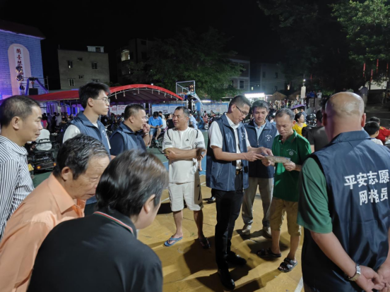 夜访宣传,当好政策“传声筒”。活动中,兰石镇部分市、镇人大代表与镇村工作人员走进兰石村文娱活动中心,利用群众过来观看粤剧演出的契机,在人群中开展平安建设政策知识宣传,宣传氛围十分浓厚。代表们向过往的群众派发《广东省平安建设条例》《平安吴川与法同行》《强制报告制度》等与平安建设相关的法律法规和政策知识,重点向群众宣传了扫黑除恶、禁毒、反邪教、道路交通安全等贴近群众日常生活的知识内容,并耐心向群众讲解电信诈骗、养老诈骗案例,宣传防范诈骗知识,增强防范诈骗能力。代表们的宣传,吸引大量过往群众驻足参与,号召群众积极参与平安建设、树立平安理念、共享平安成果,使平安建设深入人心、家喻户晓,得到了群众的一致好评。