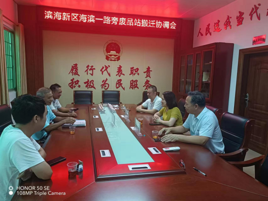 为全面推进市级重点项目滨海新区海滨一路的清表工作进度,保障项目顺利实施。市人大代表、海滨街道党工委书记杨鹏晖,市人大代表、海滨街道人大工委主任陈亚超及征地工作组在海滨街道人大代表中心联络站接见了海滨一路旁废品站老板,认真听取废品站老板关于废品站搬迁过程中的诉求。
